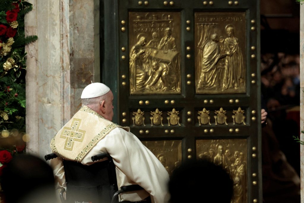 epa11792373 Pope Francis opens the Holy Door to mark the opening of the 2025 Catholic Holy Year, or Jubilee, in St. Peter’s Basilica, at the Vatican, 24 December 2024. EPA/REMO CASILLI / POOL