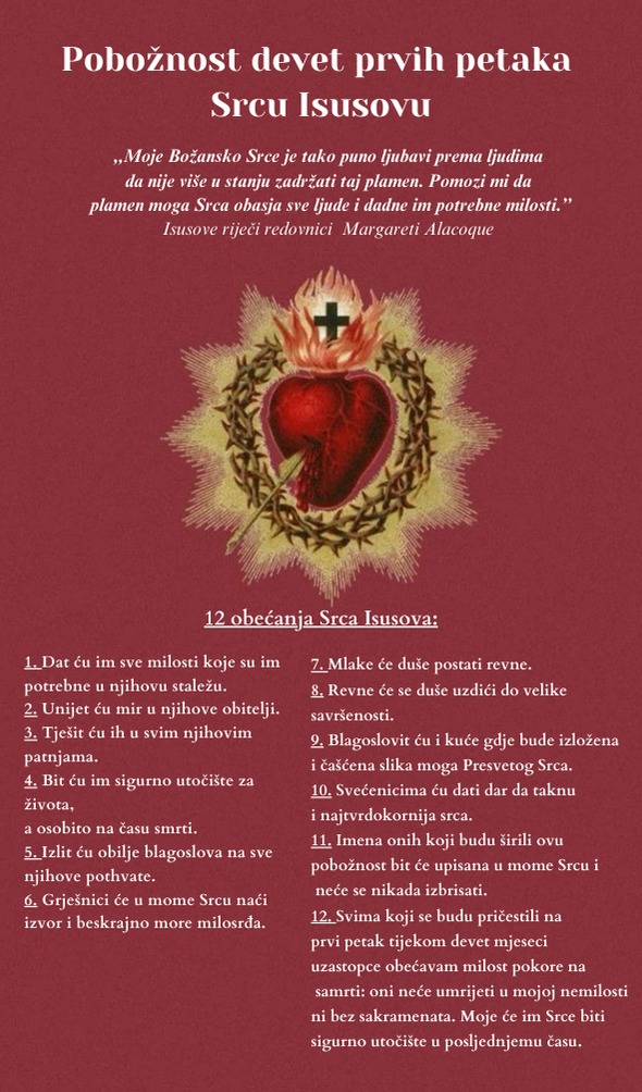 Prvi petak u mjesecu dan je posvećen Srcu Isusovu. Ova pobožnost posebna je jer izvire upravo iz Njegova srca koje se posebnim milostima otvara svima koji Ga štuju. Objavljena je sv. Margareti Alacoque, koju je Gospodin odabrao da bude glasnica porukâ njegova Srca i ,,pouzdanica Srca Isusova.’’ Svetoj Margareti je izrazio želju da Ga na prvi petak primamo u svetoj pričesti s nakanom da mu pružimo 𝐳𝐚𝐝𝐨𝐯𝐨𝐥𝐣š𝐭𝐢𝐧𝐮 𝐳𝐚 𝐬𝐯𝐞 𝐮𝐯𝐫𝐞𝐝𝐞, 𝐧𝐞𝐦𝐚𝐫𝐧𝐨𝐬𝐭𝐢 𝐢 𝐩𝐫𝐢𝐣𝐞𝐳𝐢𝐫 š𝐭𝐨 𝐦𝐮 𝐢𝐡 𝐥𝐣𝐮𝐝𝐢 𝐧𝐚𝐧𝐨𝐬𝐞 𝐮 𝐏𝐫𝐞𝐬𝐯𝐞𝐭𝐨𝐦 𝐬𝐚𝐤𝐫𝐚𝐦𝐞𝐧𝐭𝐮. Ne treba stoga niti napominjati važnost svete ispovijedi, ukoliko nismo u stanju milosti, kao priprave za svetu pričest.